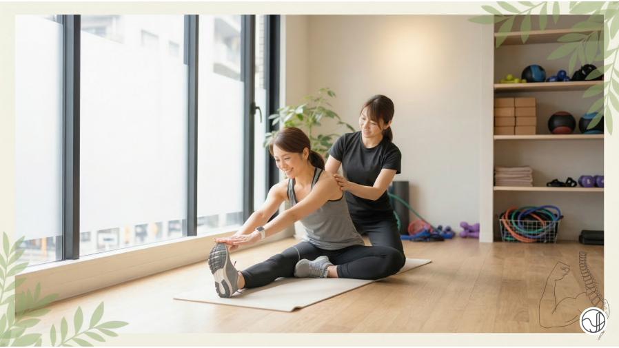 初回は姿勢チェックと軽めのストレッチから始め、無理に負荷をかけず、できることから少しずつレベルを合わせていくので安心して続けられます。